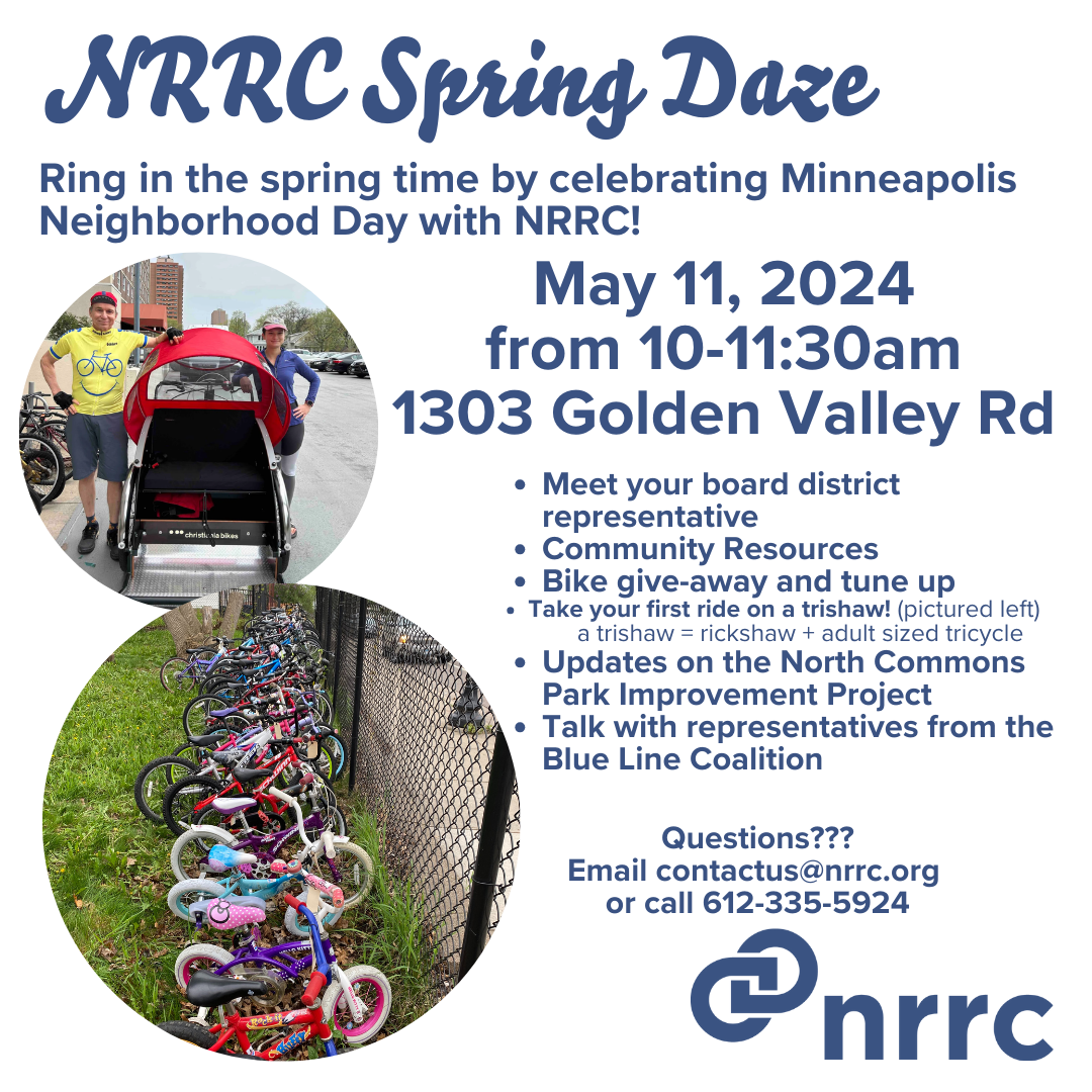 Spring Daze Saturday, May 11, 2024 10:00 AM 11:30 AM 10:00 11:30 Northside Residents Redevelopment Council (NRRC) 1303 Golden Valley Road Minneapolis, MN, 55411 United States (map) Google Calendar ICS
